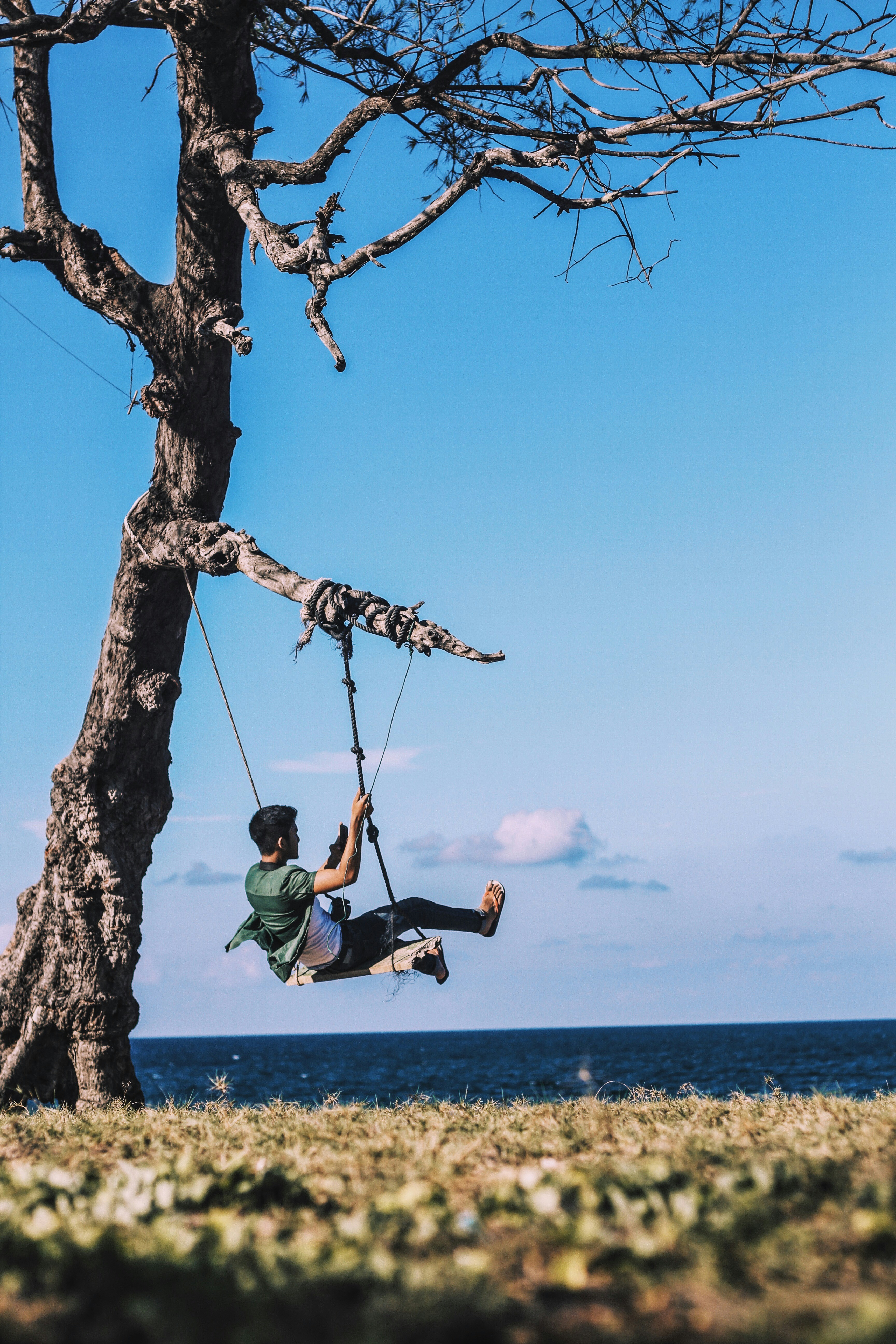 Man On Swing Mounted On Tree Near Body Of Water Photo Free Swing