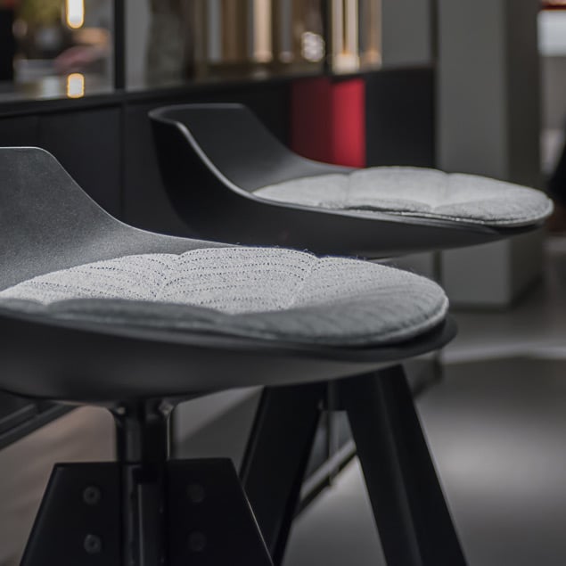 Flow pouf is designed to perfectly adapt to both domestic and professional environments. Available in numerous bases and finishes. Flow stool with a white or black shell the shellmade from moulded polyurethane is in goffered matt white or black.
