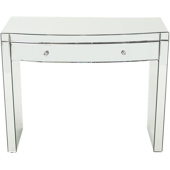 Opt for square metal styles or round glass for your bed or a sofa side or browse our pretty vases to create a statement corner. With classic consoles that make a statement and mirrored dressers that add your personality to your room our collection is practical and stylish. This console table features a fully mirrored top and open ring base design.